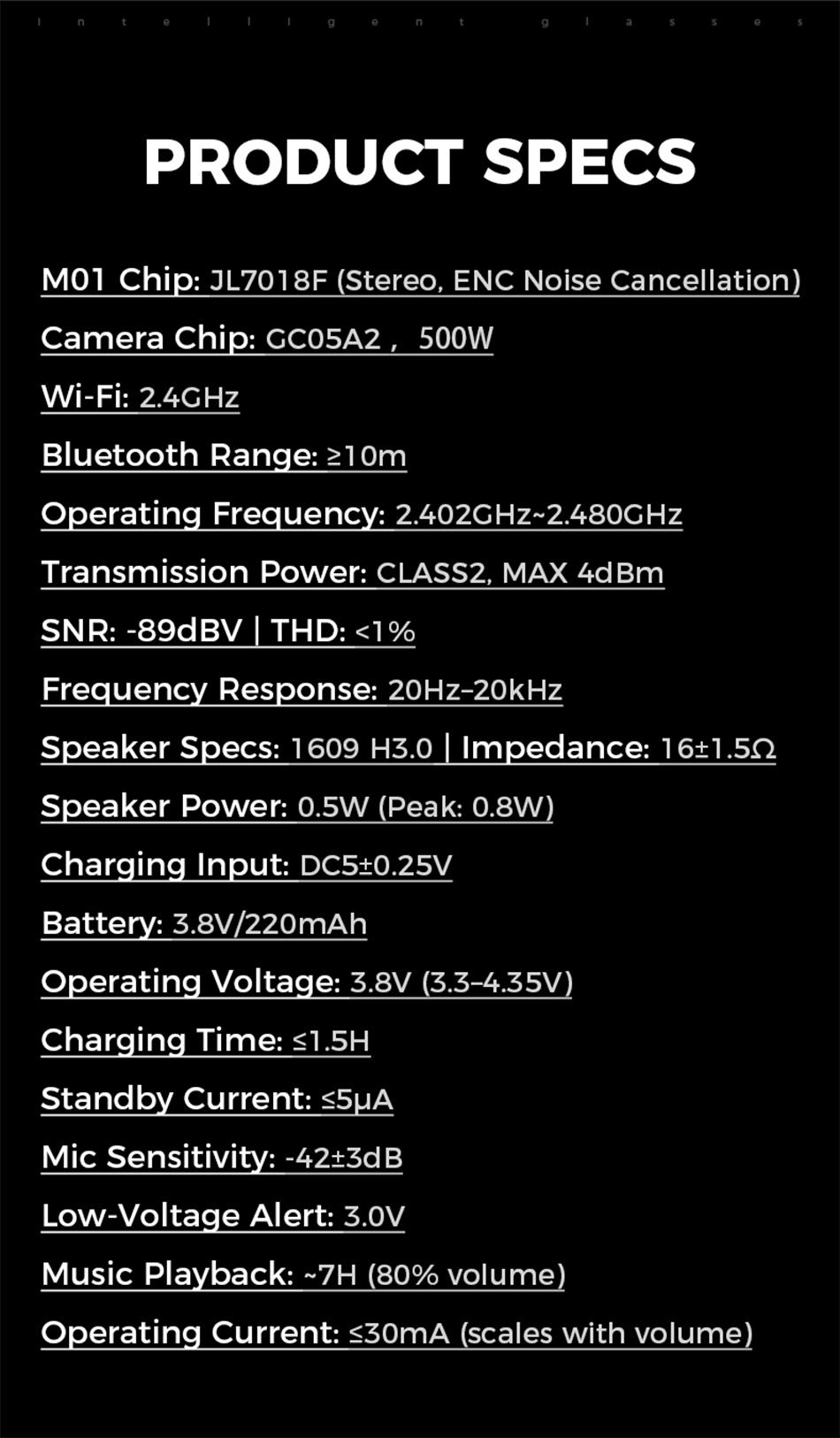 Main Functions : Wake up by voice, music playback, music control, receive calls, shooting, access to Chat GPT large model, see the picture in kind, real-time translation, etc., shooting anti-shake, wifi transmission, dual-microphone noise reduction, single-point touch, wear detection, etc.